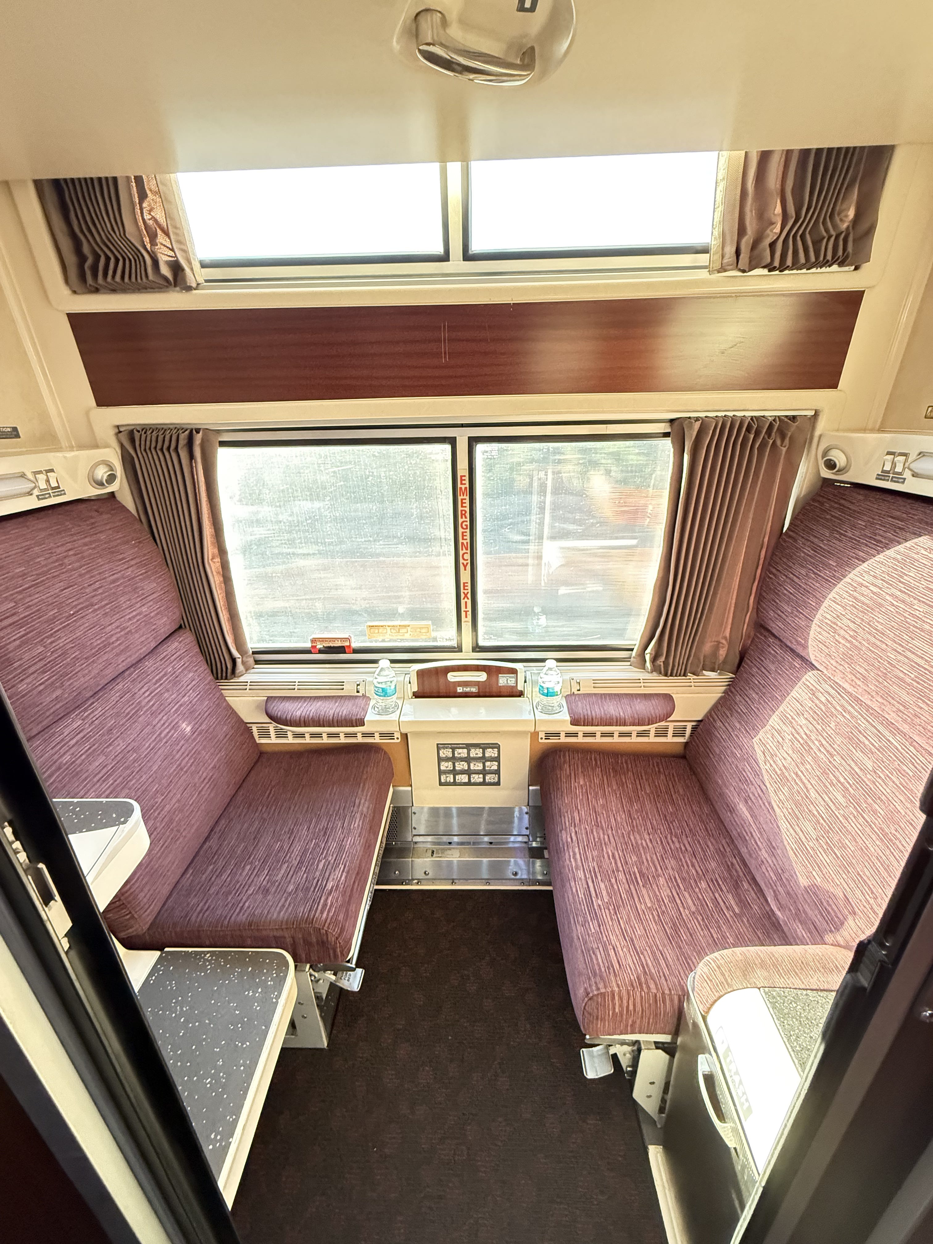 So, I plonked myself down. The seat was wider and more comfortable than expected. The roomette is actually a bunk room for two, with seats facing one another and a top bunk that pulls down from the ceiling. There is modest in-room storage, but then again, I only ever travel with a duffle bag anyway. Ladies will likely need to store their multiple suitcases elsewhere on the train.