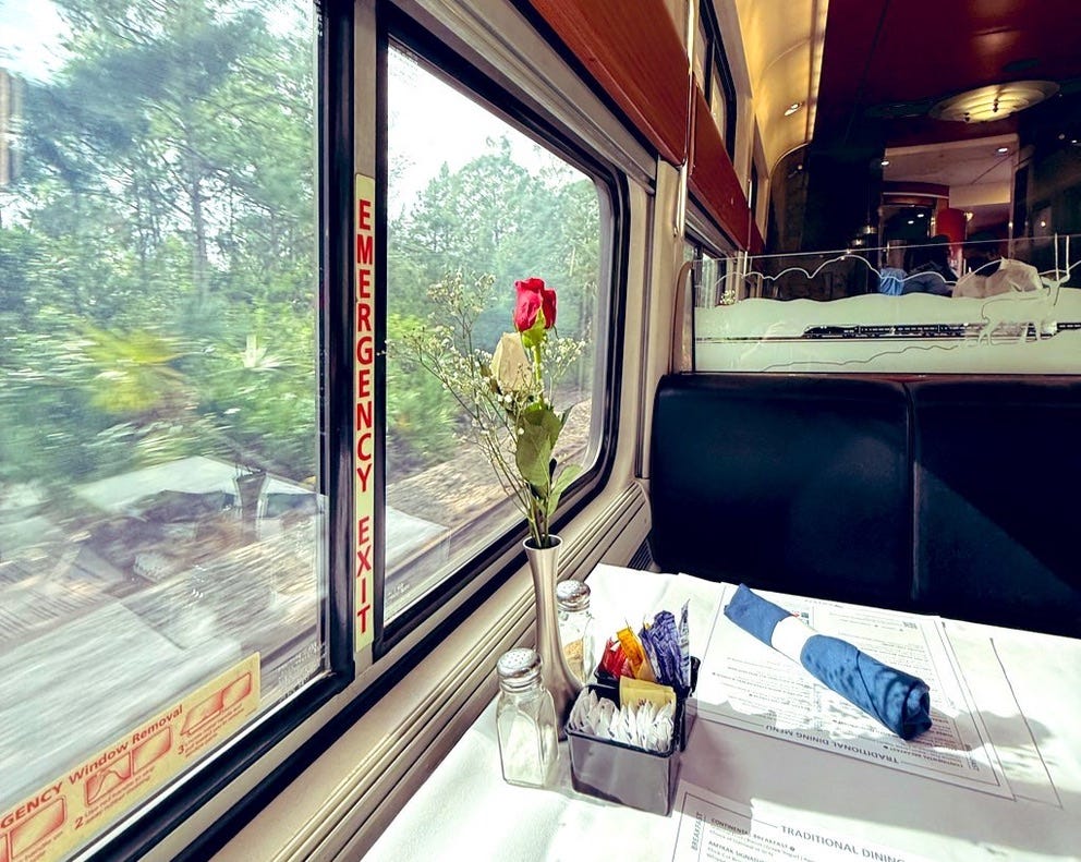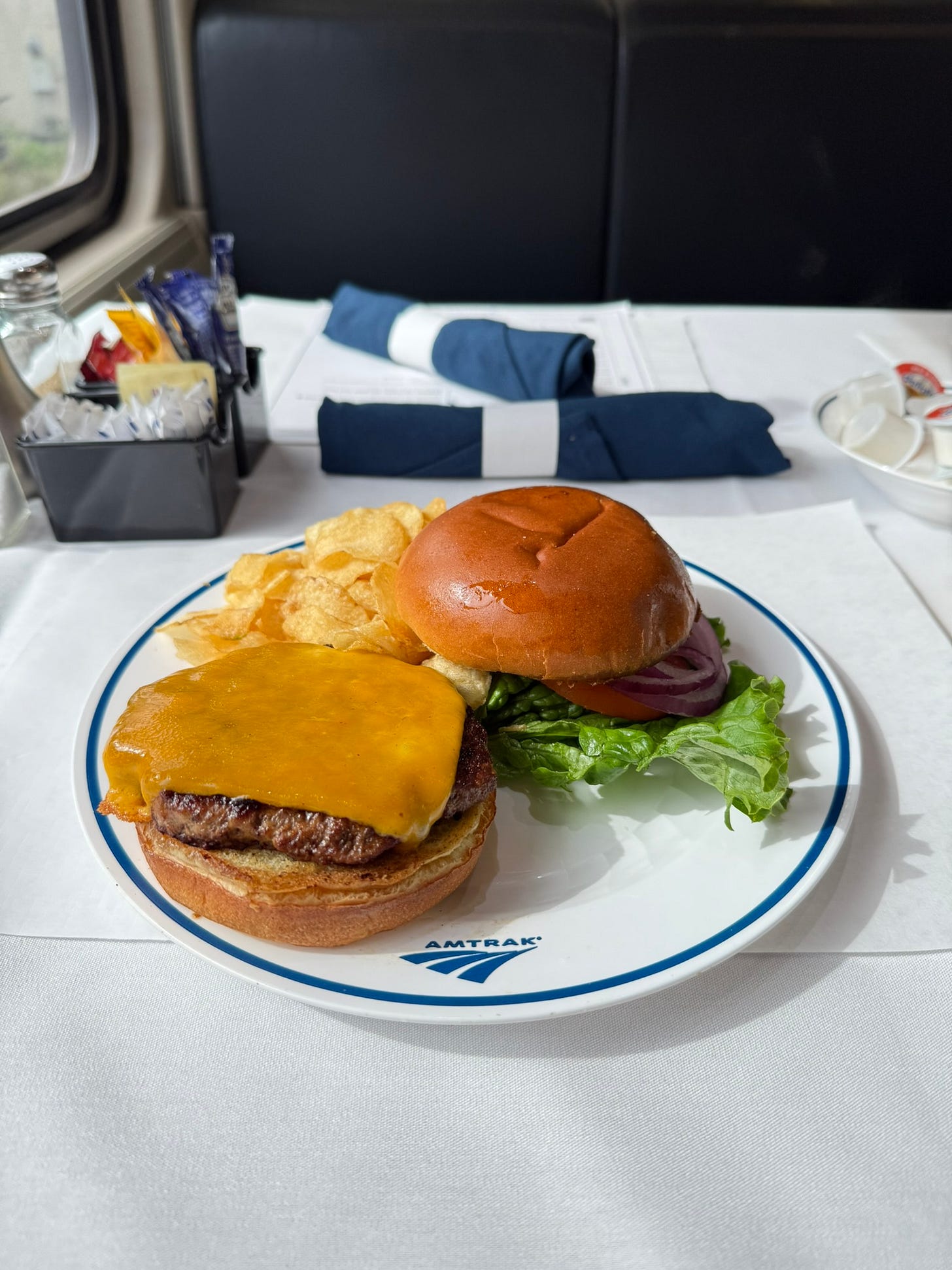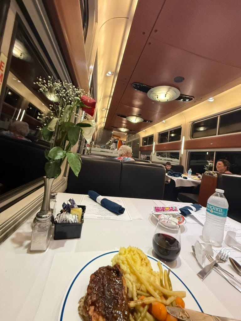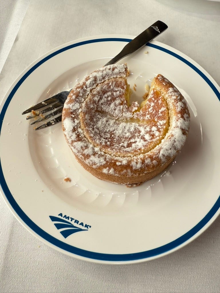 “Coffee?! That’s the first time I’ve heard that for lunch. I had already written Coke!” said the attendant. I don’t drink Coke. And either way, I’m not sure I believed him. He seemed more like a chatterbox. If no one had ordered coffee at lunch from him, he couldn’t have worked here long, I thought. In fairness to him, the dining car has only returned in the past few years after multiple attempts to force first-class passengers into the line at the Cafe Car with economy ticket holders. I popped my head into that situation and can only describe it as a Simpsons-style parody of America. I never went back after stretching my legs the first time.