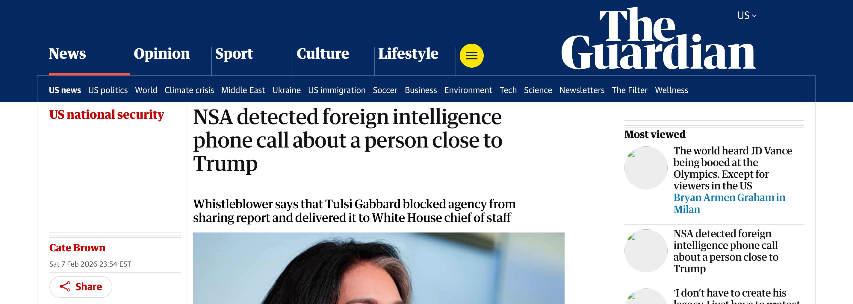 This story was amended on 7 February 2026 to clarify that the phone call was between two people associated with foreign intelligence who discussed someone close to Donald Trump, not between someone and a person close to Trump. The earlier version was based on multiple phone calls with the whistleblower’s attorney, Andrew Bakaj, who later said he misspoke and clarified the actual details of the call.