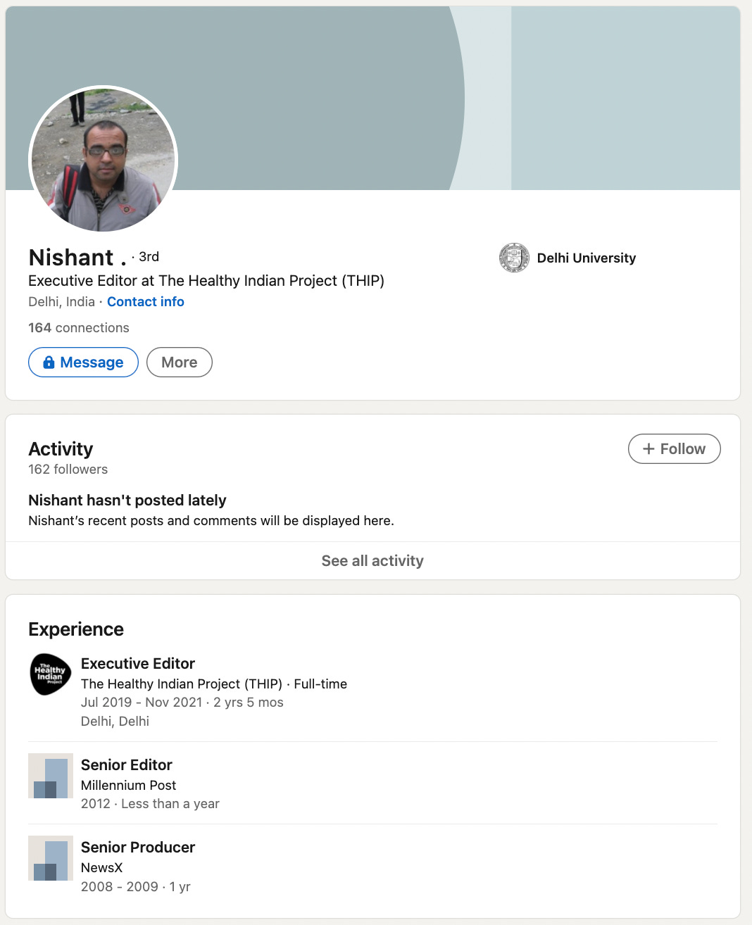 Nishant is alleged to be a “seasoned journalist with over 18 years of experience,” but even a cursory glance at his LinkedIn page shows no such history. Instead, Nishant himself claims to have worked for something called “NewsX” for one year, the “Millenium Post” for less than a year, and THIP for two years and five months. Hardly the 18 years of journalistic experience THIP claims: